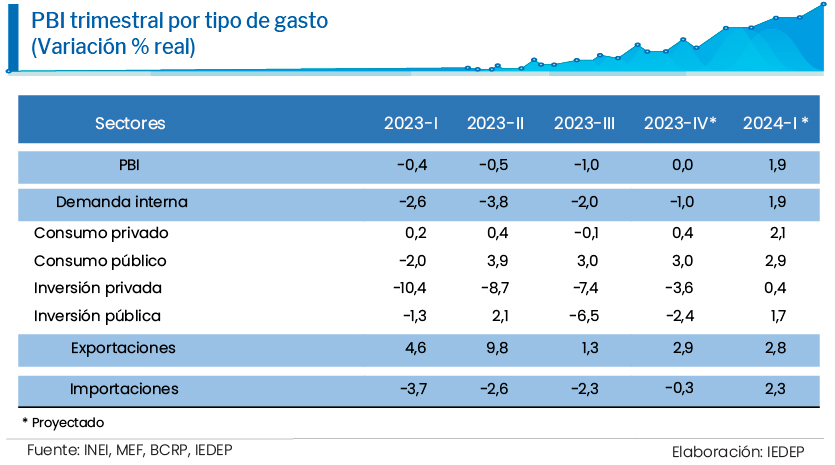 Por el lado del gasto, el consumo privado será el principal impulsor del PBI en el primer trimestre del año. Se proyecta un crecimiento del 2,1 %, en comparación con el modesto incremento del 0,2 % en el mismo periodo de 2023. Asimismo, se estima un rebote de la inversión privada y pública, con una débil expansión del 0,4 % y 1,7 %, respectivamente, explicado por los magros resultados del año pasado. Por el lado del mercado externo, también se proyecta un aumento de las exportaciones en un 2,8 %, considerando un panorama mundial moderado.