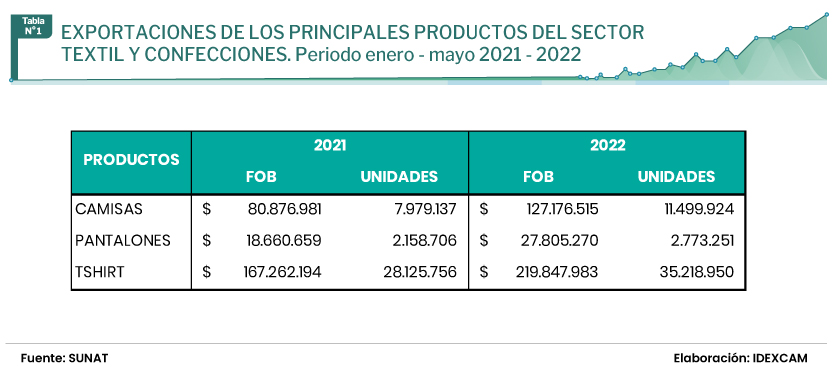 Uno de los productos mas producidos y exportados por Perú del sector textil y confecciones son las camisas. Hasta mayo de 2022 ha mantenido un crecimiento envidiable de 57% en valor y de 44% en unidades exportadas respecto a similar periodo del año anterior.