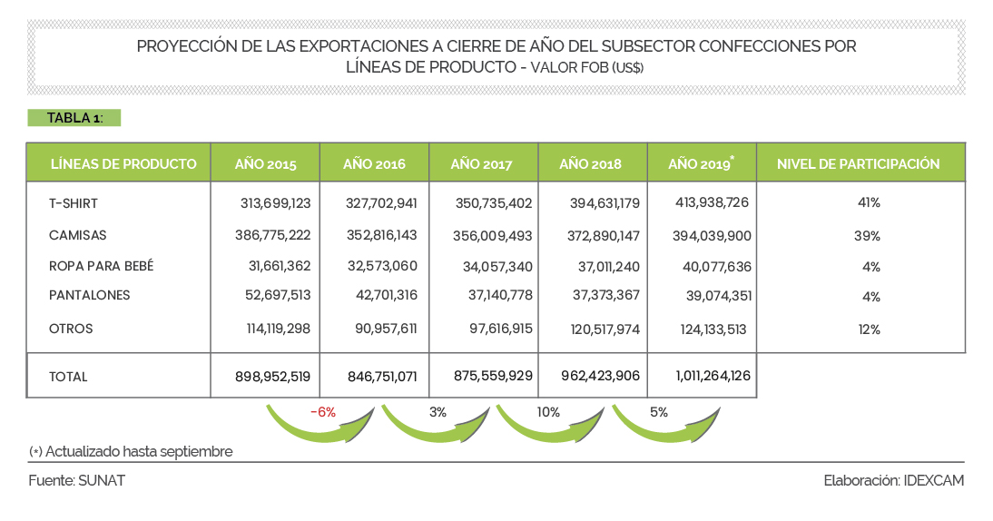 Recordemos que en el año 2018, las exportaciones de este rubro cerraron con un crecimiento del 10% (US$ 962 millones) siendo las principales líneas de productos exportados: polos, camisas, ropa para bebé y pantalones.