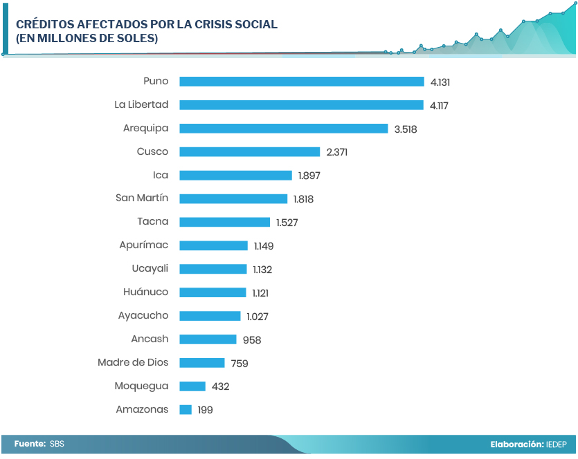 Si consideramos las 15 regiones mencionadas, y dentro de estas a las provincias y distritos que en algún momento han sido afectados por los conflictos sociales, con base en la información de Defensoría del Pueblo, SBS y diversos medios, se estima que un total de S/ 26.156 millones entre créditos mypes y de consumo podrían enfrentar riesgo de impago, por los menores ingresos que tendrían tanto los negocios como las familias debido al freno de sus actividades. Hay que tener presente que los créditos mencionados son tanto para negocios formales como informales.