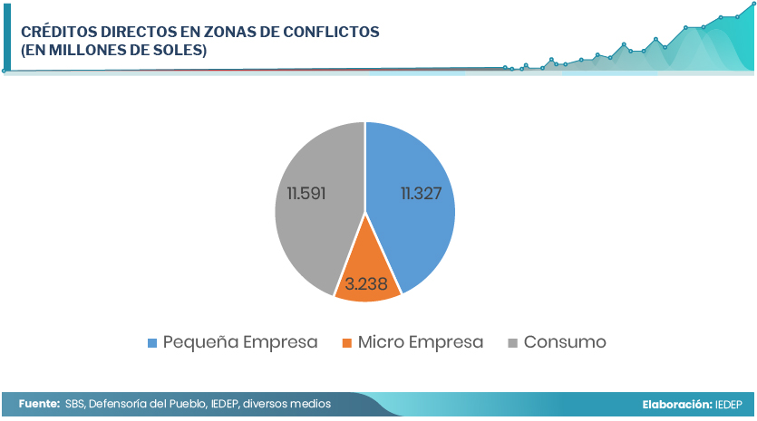 En el caso de los créditos a las pequeñas empresas, los créditos otorgados en las regiones en conflicto ascienden a S/ 11.327 millones, que representan el 25,4% de los créditos totales a nivel nacional. Las regiones de Puno (S/ 2.059 millones), La Libertad (S/ 1.714 millones), Arequipa (S/ 1.449 millones) y Cusco (S/ 1.173 millones) concentran el 56,5% de dicho total.