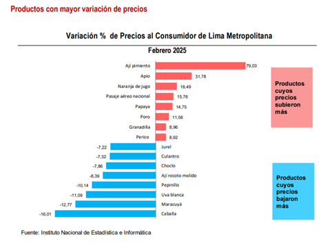 Entre los productos que bajaron fueron caballa (-16,01 %), maracuyá (-12,77 %), uva blanca (-11,09 %), pepinillo (-10,14 %), ají rocoto molido (-8,39 %), choclo (-7,86 %), culantro (-7,32 %) y jurel (-7,22 %).