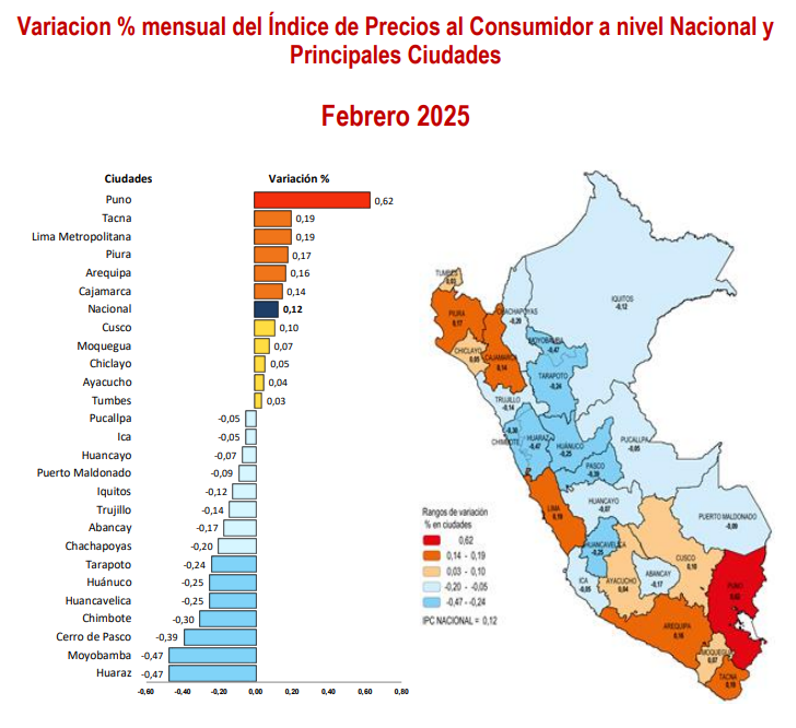 En el segundo mes del año, los precios subieron en once ciudades del país. Las mayores alzas se registraron en Puno (0,62 %), seguida de Tacna y Lima Metropolitana (0,19 %), Piura (0,17 %), Arequipa (0,16 %) y Cajamarca (0,14 %).