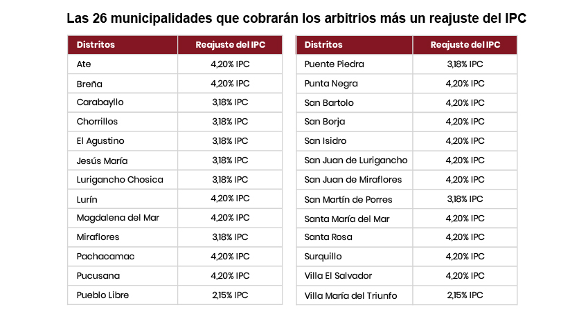 • La Municipalidad de Independencia cobrará los arbitrios del año 2021 con un aumento del 28,26% de Índice de Precios al Consumidor (IPC).
