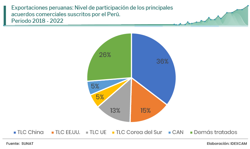 En la actualidad, el Perú ha firmado 22 acuerdos comerciales con países de diferentes continentes. Estos acuerdos comerciales potenciaron al Perú en sectores económicos en los cuales había una inversión relativamente baja y que, gracias a los beneficios que otorga esta herramienta del comercio exterior, pudieron crecer. Al cierre del 2022, el 91,27 % de las exportaciones peruanas (US$ 57 639 millones) van a economías y bloques con los que tenemos TLC suscritos.
