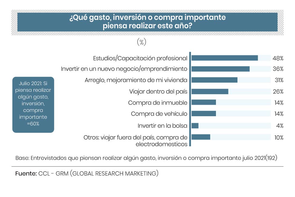 Es así que, a la pregunta sobre si este año piensan hacer algún gasto, inversión o compra importante, el 60% señala que sí. De este total, casi el 50% de los encuestados afirmó que este año invertirán en estudios y/o capacitación profesional.