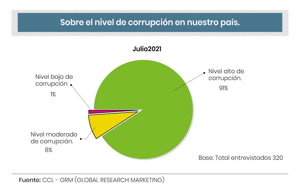 Es así que el 91% de las personas encuestadas manifestó que hay un alto nivel de corrupción; mientras que el 8% moderado y el 1% bajo.