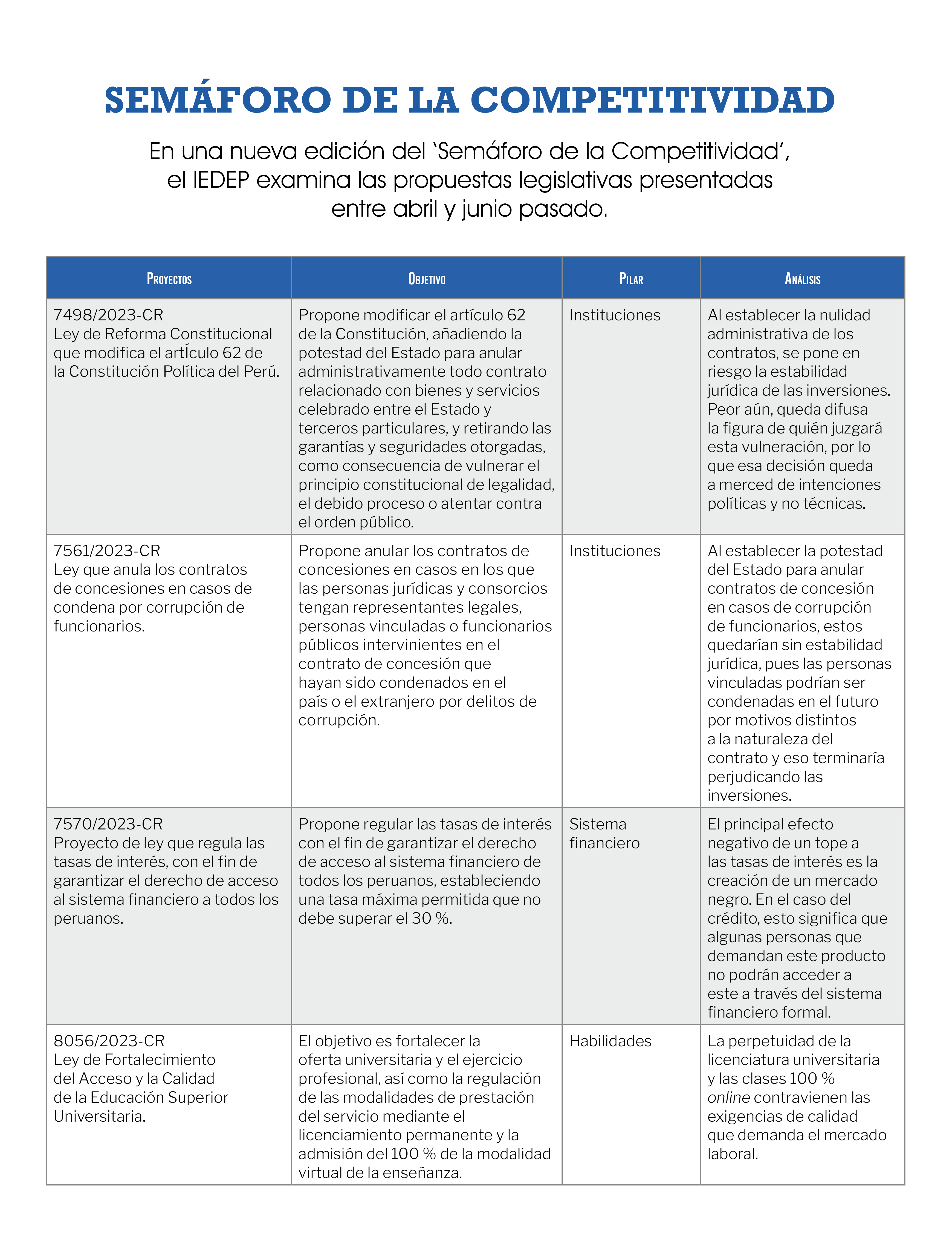 Como puede verse, el análisis del IEDEP sobre los proyectos de ley presentados en el Congreso entre abril y junio pasados revela un panorama mixto en cuanto a su impacto en la competitividad del país. No obstante, para mejorar la competitividad del Perú, es esencial que las propuestas legislativas sean cuidadosamente analizadas, tomando en cuenta todos los escenarios positivos y negativos que pudieran causar y, basándose en ellos, aprobarlos o no. Solo así se podrán crear condiciones propicias para un crecimiento sostenido y una mayor prosperidad para todos los peruanos.