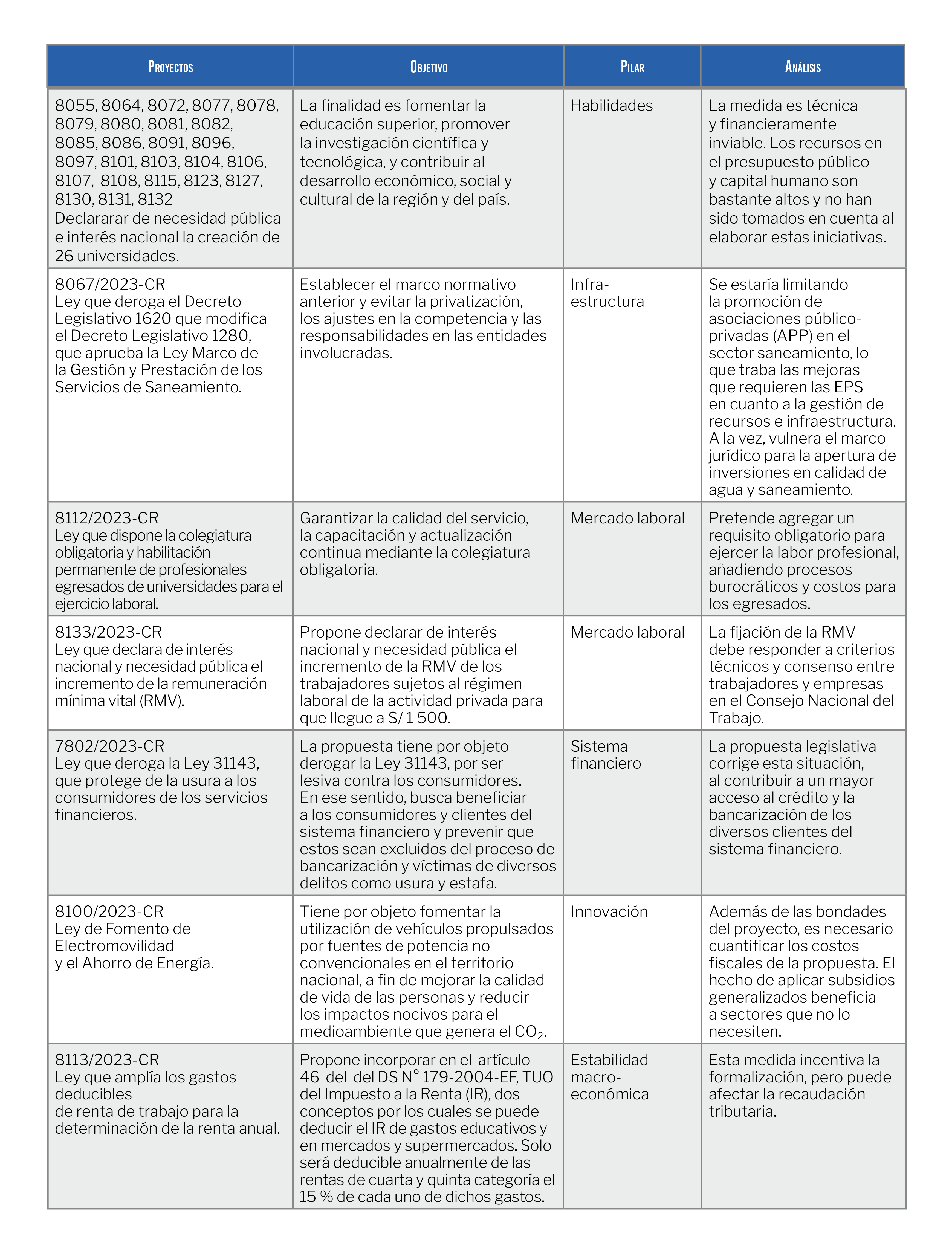 De otro lado, el PL 8056 propone cambios en la Ley Universitaria, al postular el licenciamiento permanente y la posibilidad de tener programas de estudios 100 % virtuales. Esta iniciativa no contribuye a la mejora en el capital humano necesario para un país más competitivo.
