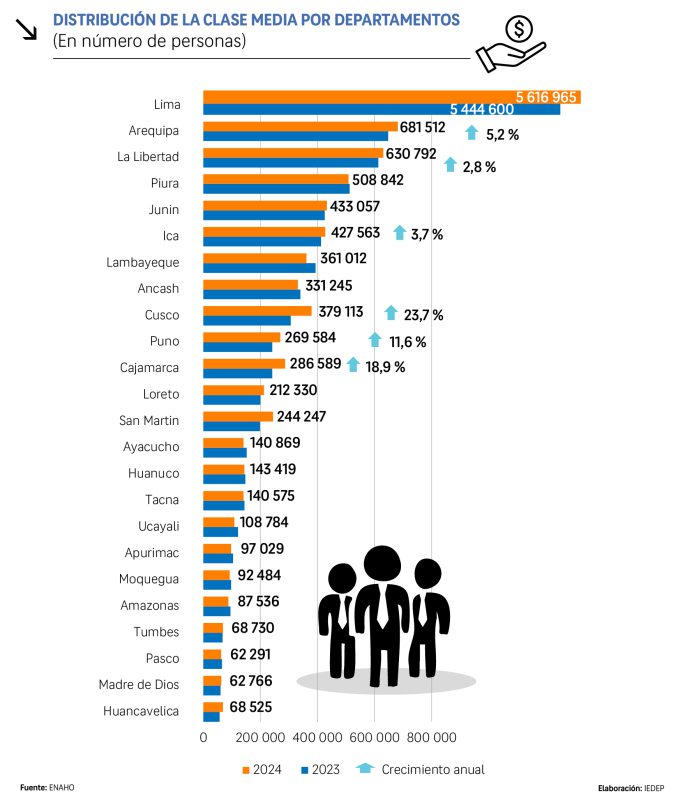 Si bien Lima concentra el 51 % de la clase media nacional, importantes ciudades en provincias se han consolidado como nichos relevantes y estratégicos. En el presente año se habrían incorporado más de 367 000 personas a la clase media, de las cuales un 53 % se ubicaron en ciudades fuera de Lima. Entre ellas destacan, Cusco con una expansión del 23, 7 %; Cajamarca, con 18, 7 %; y Puno, con 11, 6 %.