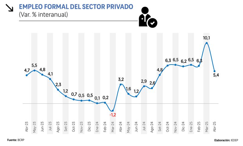 A su vez, el empleo formal privado está asociado a ingresos estables, acceso al crédito y mayor propensión al consumo. Según datos del BCRP, entre enero y abril de este año, el empleo formal privado creció a un ritmo promedio mensual de 7, 1 %, con un pico de 10, 1 % en marzo. En abril, el crecimiento interanual fue de 5, 4 %, con aumentos en los sectores Agropecuario (8,8%), Pesca (2,6 %), Minería (6,6 %), Manufactura (3,6 %), Construcción y Comercio (7,2 %) y Servicios (4 %).