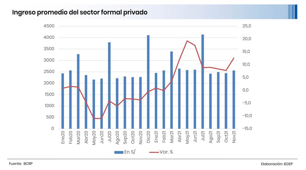 El empleo y el ingreso laboral del sector formal privado han venido mejorando sostenidamente en los últimos ocho meses. En noviembre pasado, el ingreso promedio se ubicó en S/ 2.560, creciendo en 12,6% respecto a similar mes del año 2020. Si tomamos en cuenta los 3’971.962 trabajadores ocupados en el sector formal privado a dicho mes, la masa salarial supera los S/ 10.000 millones, un 21,5% superior respecto al 2020.