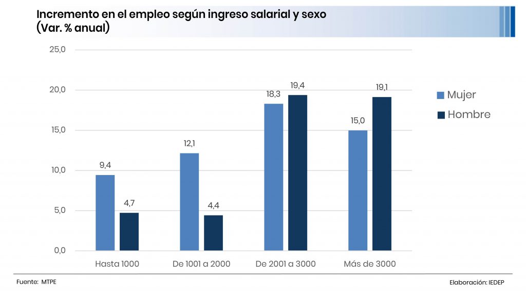Los mayores puestos de trabajo creados en el sector formal privado se identifican en aquellos que ganan entre S/ 2.001 y S/ 3.000 (19,8%) y más de S/ 3.000 (18,1%). Se observó también que a medida que bajó el rango de ingresos, el crecimiento del empleo fue menor, así entre S/ 1.001 y S/ 2.000, creció en 7,2%; y hasta S/ 1.000, en 6,4%.