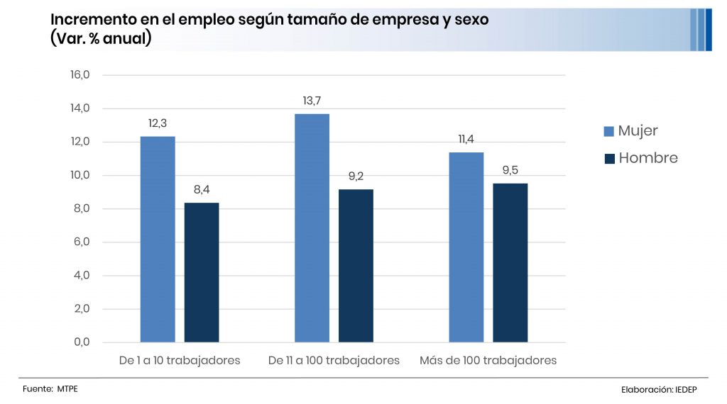 El empleo formal evaluado para empresas con distinto número de trabajadores se expandió en mayor porcentaje en mujeres que en hombres. En el caso de empresas de 1 a 10 trabajadores, el empleo de mujeres creció en 12,3% y de hombres en 8,4%.