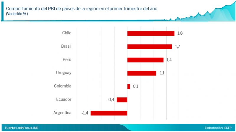 En el contexto de América del Sur, la mayoría de los países experimentan un crecimiento del PBI para el primer trimestre del año, que oscila entre el 1 % y el 2 %. Chile (1,8 %), Brasil (1,7 %), Perú (1,4%) y Uruguay (1,1 %) muestran cifras positivas, mientras que Colombia (0,1 %) se encuentra rezagada. De otro lado, se proyecta una caída en Ecuador (-0,4 %) y en Argentina (-1,4 %), esta última como consecuencia de las políticas de ajuste implementadas para reducir la inflación.