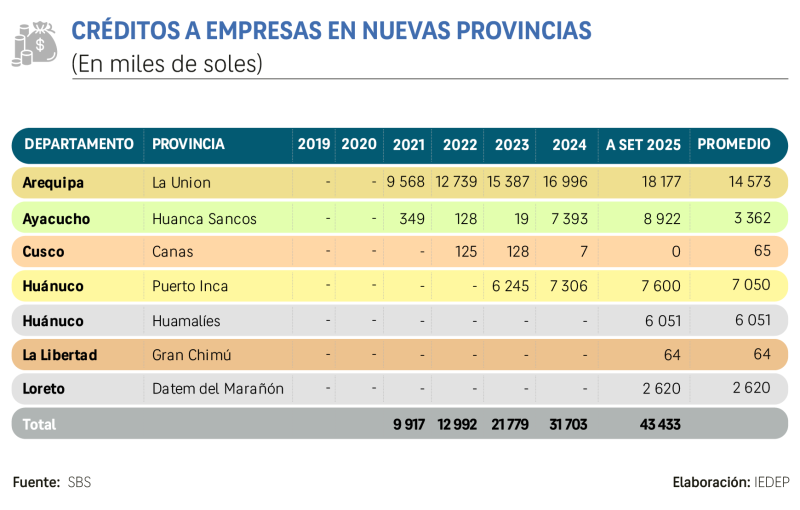 Entre 2021 y septiembre de 2025, siete provincias del interior del país lograron acceder por primera vez al financiamiento empresarial formal, marcando un hito en la expansión territorial del crédito. Este avance se traduce en un promedio anual de S/ 43.4 millones en financiamiento, destinado íntegramente a pequeñas y microempresas. Las provincias que se han incorporado al mapa crediticio nacional incluyen La Unión (Arequipa), Puerto Inca y Huamales (Huánuco), Huanca Sancos (Ayacucho), Canas (Cusco), Gran Chimú (La Libertad) y Datem del Marañón (Loreto), lo que les ha permitido diversificar sus fuentes de capital y fortalecer sus economías locales.