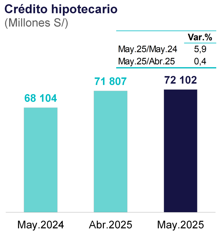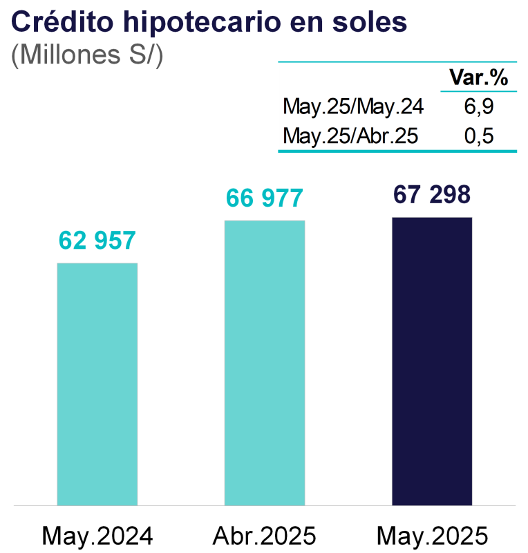 En términos mensuales, el crédito hipotecario registró un aumento de 0,4 % en mayo, impulsado por los préstamos concedidos en soles, los cuales crecieron un 0,5 %.