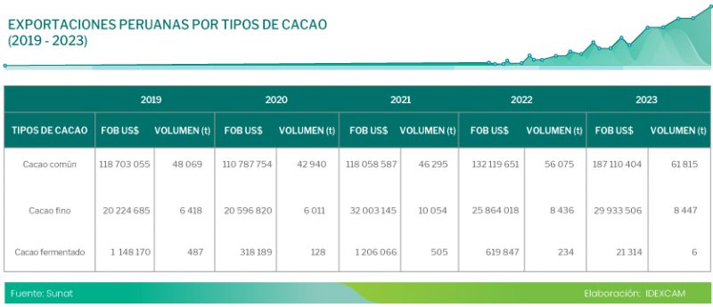 Cabe señalar que el cacao común vendría ser el tipo de cacao más exportado por Perú, llegándose a enviar en 2023, unas 61 814 toneladas por un valor de alrededor de US$ 187 millones, lo que representó el 88 % de participación en la exportación de este producto. Le siguen el cacao fino, con 8 447 toneladas por más de US$ 29 millones, con un 11 % de participación.
