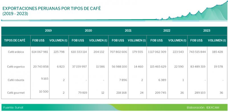 En el siguiente cuadro detallamos los tipos de café que el Perú exporta al mundo, según la base de la Superintendencia Nacional de Administración Tributaria y Aduanas (Sunat). Cabe señalar que estos resultados se basan en cómo los exportadores peruanos de café describen sus productos en las declaraciones respectivas ante aduanas.