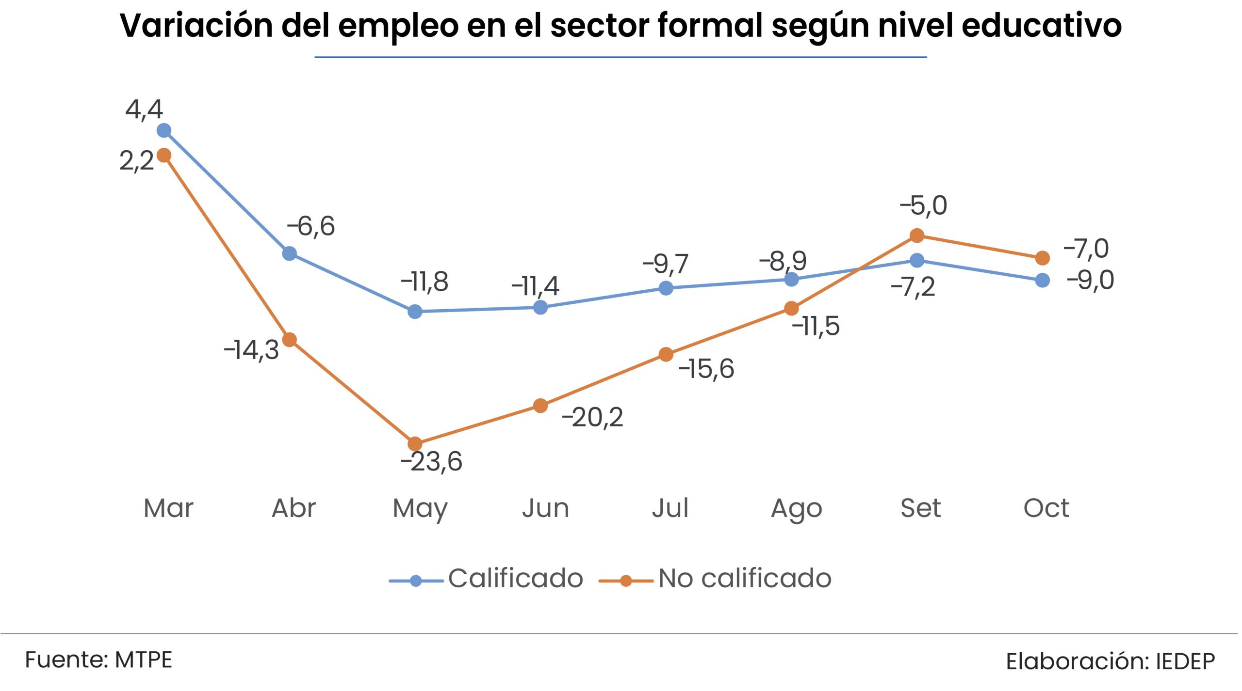Pese a este resultado, el empleo privado se ha recuperado en cinco regiones, Ica (9,4%), La Libertad (9,4%), Amazonas (6,5%), Lambayeque (4,1%) y Piura (3,8%). Por otro lado, entre los meses de marzo y octubre del 2020, se observó una mayor caída en el empleo no calificado en comparación al empleo calificado, con tasas de dos dígitos en varios meses del periodo analizado. La caída del empleo calificado ha sido menor y a una tasa menos volátil.