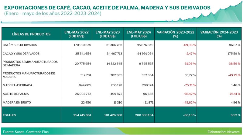 De los productos sujetos al nuevo reglamento, el Perú exporta principalmente café, cacao, aceite de palma y madera; y sus derivados, a la Unión Europea. Entre enero y mayo de este año, se exportaron alrededor de US$ 200 000 000 de estas líneas de producto a la UE, mostrando un incremento del 97,52 % respecto a similar periodo de 2023.