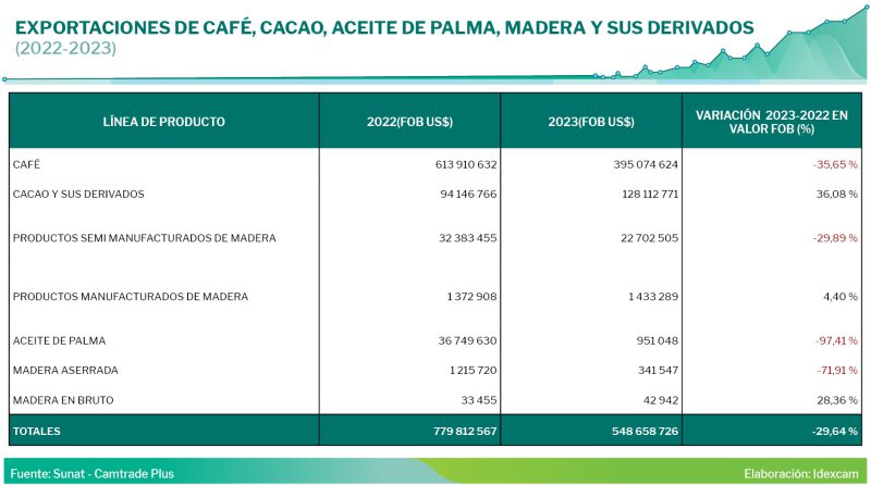 Al cierre de 2023, las exportaciones de café, cacao, aceite de palma, y madera y sus derivados a la UE alcanzaron un monto de alrededor de US$ 548 000 000, una caída del 29,64 %, respecto al 2022. El café fue la línea de producto más exportada con US$ 395 000 000, una disminución del 35,65 % respecto a 2022. A su vez, las exportaciones de cacao y sus derivados aumentaron un 36,08 %, alcanzando los US$ 128 000 000.