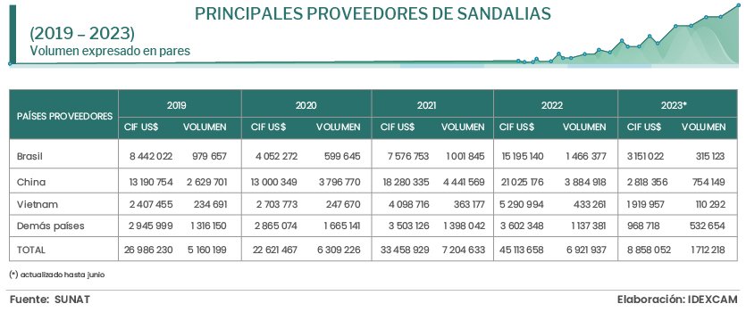 En el Perú, entre los productos más demandados tenemos las sandalias; así en el 2020 llegaron a importarse un total de alrededor de 6 300 000   pares, una cifra que, en ese entonces, fue récord y que desde ese año ha mantenido ese monto aproximado de importación. En el 2022, se llegaron a importar un total de 6 900 000 de pares a un valor aproximado de US$ 45 000 000; mientras que hasta junio del 2023, se importaron alrededor de 1 700 000 de pares, y se espera que al cierre del año se importe una cantidad aproximada a la registrada en el 2022, ya que el último trimestre es el más dinámico en ese sentido. La mayoría de sandalias son traídas desde Brasil, China y Vietnam, países que tienen un nivel de participación del 35 %, 31 % y 21 %, respectivamente.