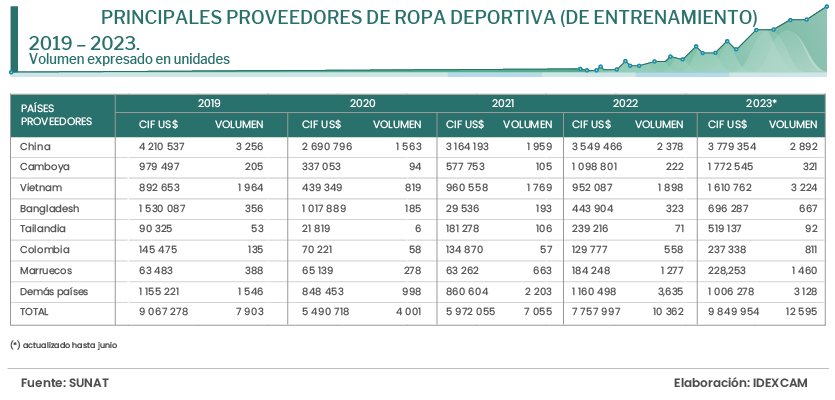 La ropa deportiva más demanda son las prendas sintéticas, la cuales tienen un nivel de participación del 74 % de las importaciones de este rubro. La mayoría de estas prendas sintéticas son traídas desde China, Camboya y Vietnam, países que tienen un nivel de participación del 38 %, 18 % y 16 %, respectivamente.