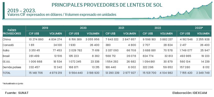 Los lentes de sol son otra línea de productos muy demandada. De enero a junio del presente año, el volumen importado de este producto creció en 36 % con un total de 2 349 749 unidades por un valor de alrededor de US$ 7 100 000, la mayoría obtenidos desde China con un nivel de participación del 96 %. Gran parte de estos lentes de sol están hechos con monturas de policarbonato y los principales meses de importación son setiembre, octubre y noviembre.