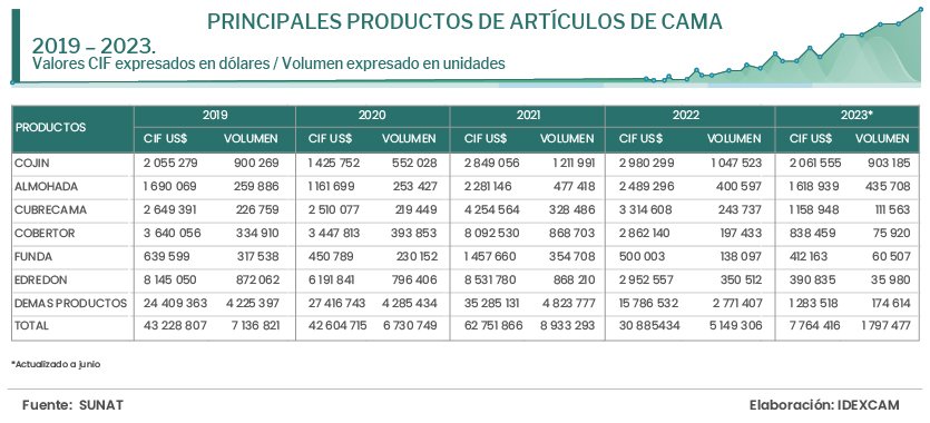 Cabe señalar que otra línea de producto importante son los artículos de cama. Entre los años 2019 y 2021, fueron uno de los productos más importados del subsector Descanso y Bienestar, llegando a la cifra récord de alrededor de  US$ 43 200 000 para el 2019 y de US$ 62 700 000 para el  2021. En lo que va del 2023, el valor importado llega a los US$ 7 700 000. Entre los productos más destacados tenemos: cojines, almohadas, cubrecamas, cobertores, fundas y edredones.
