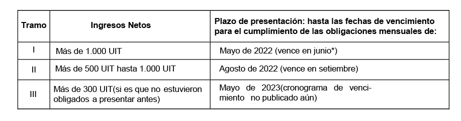 A continuación, brindamos un resumen de las obligaciones vigentes y del cronograma para los nuevos obligados a declarar en el 2022 y 2023, aprobado mediante la Resolución de Resolución No. 41-2022/Sunat.
