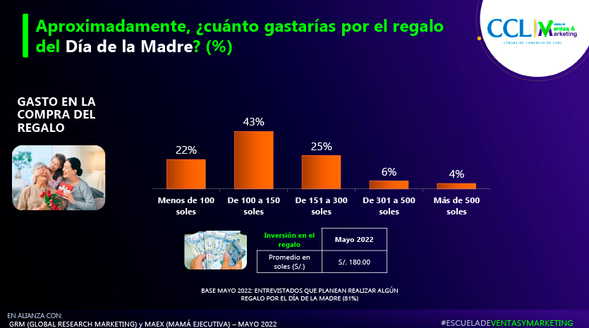 El 43% de los encuestados señaló que gastará entre S/ 100 a S/ 150 en sus regalos en el Día de la Madre, el 25% indicó que destinará entre S/ 151 y S/ 300, y un 22% gastará menos de S/ 100; mientras que el gasto promedio será de S/ 180.