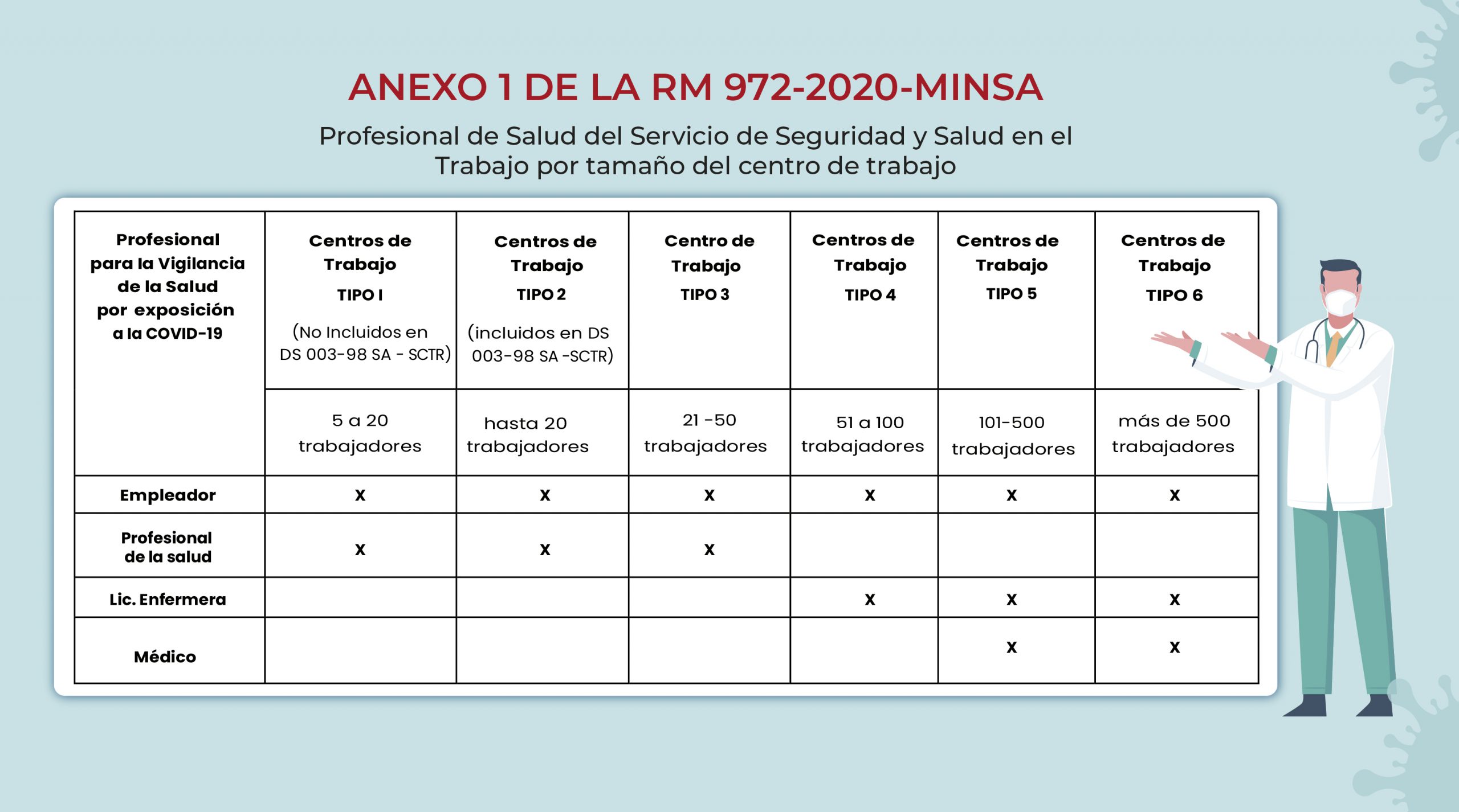 El 29 de noviembre del 2020 se publicó en El Peruano la RM 972-2020-MINSA, con la cual el Ministerio de Salud (Minsa) aprobó el documento técnico denominado Lineamientos para la Vigilancia Prevención y Control de la Salud de los Trabajadores con Riesgo de Exposición a SARS-COV-2, derogando el Art. 1 de la RM 448-2020- MINSA y el anexo de la misma.