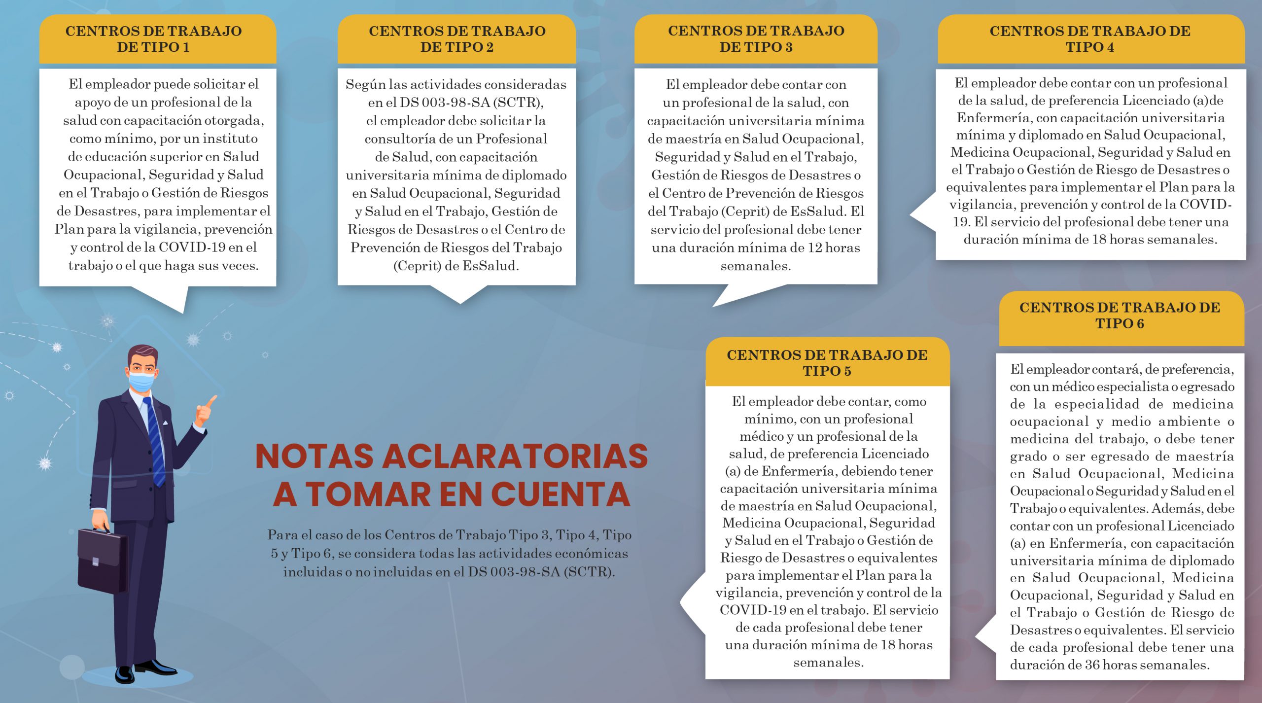 Ámbito de aplicación.- El nuevo documento técnico incorpora a las personas naturales que realizan actividades económicas, como sujetos obligados a cumplir con las normas de vigilancia, prevención y control de la salud de los trabajadores. En tal sentido, los nuevos lineamientos se aplican: