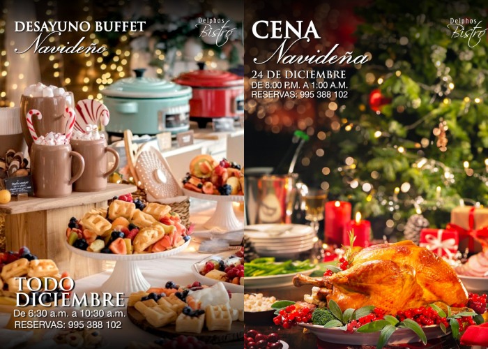 Hasta el 21 de diciembre, Delfines Hotel & Convention Center ofrece su desayuno buffet navideño, una alternativa pensada para quienes desean iniciar la jornada con una experiencia gastronómica especial. La propuesta cuesta S/79.00 de lunes a viernes y S/89.00 los sábados y domingos. Disponible en el horario de 6:30 a.m. a 10:30 a.m., y para realizar reservas, los interesados pueden comunicarse al 995 388 102.
