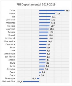En un análisis de la evolución del desempeño macroeconómico en los tres últimos años, 2017-2019 se observa que seis regiones registraron una caída del PBI en al menos un año. Por ejemplo, Apurímac, que entre los años 2010 y 2017 logró un crecimiento explosivo, en los dos últimos años se revirtió dicha tendencia con resultados negativos de -7,6% en el 2018 y 0,1% en el 2019, debido a la caída de su principal fuente de crecimiento, la minería.