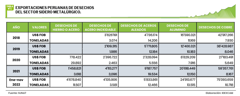 En ese sentido, se puede considerar que desde el Perú venimos contribuyendo a este esfuerzo, mediante la exportación de desechos o chatarra del sector siderometalúrgico, entre los cuales destacan: