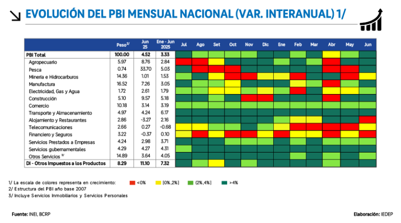 A fin de medir a lo largo del tiempo el esfuerzo y desempeño que emprenden las distintas actividades económicas, el Instituto de Economía y Desarrollo Empresarial de la Cámara de Comercio de Lima (IEDEP) implementó un sistema de semaforización de las tasas de crecimiento, con el objetivo de identificar cuáles sectores se mueven por encima de una tasa óptima en el corto plazo. Para lo cual, calificó como verde oscuro los meses donde el crecimiento del sector supera la tasa del 4%, verde claro para un crecimiento entre 2 % y 4 %, amarillo si el crecimiento se ubica entre 0 % y 2 %, y rojo cuando el crecimiento sea negativo, <0%.