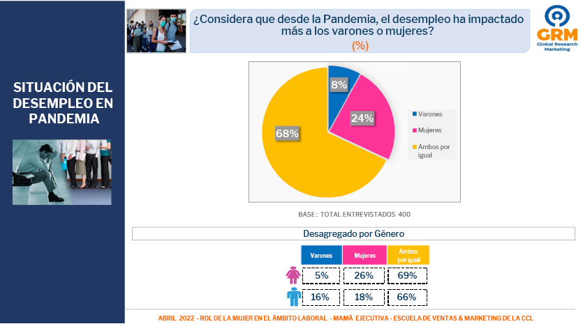 En cuanto a la situación del empleo, el 68% de los ejecutivos encuestados piensa que desde la pandemia el desempleo ha impactado a ambos géneros por igual, mientras que el 24% opina que ha impactado más a las mujeres y el 8% más a los hombres.