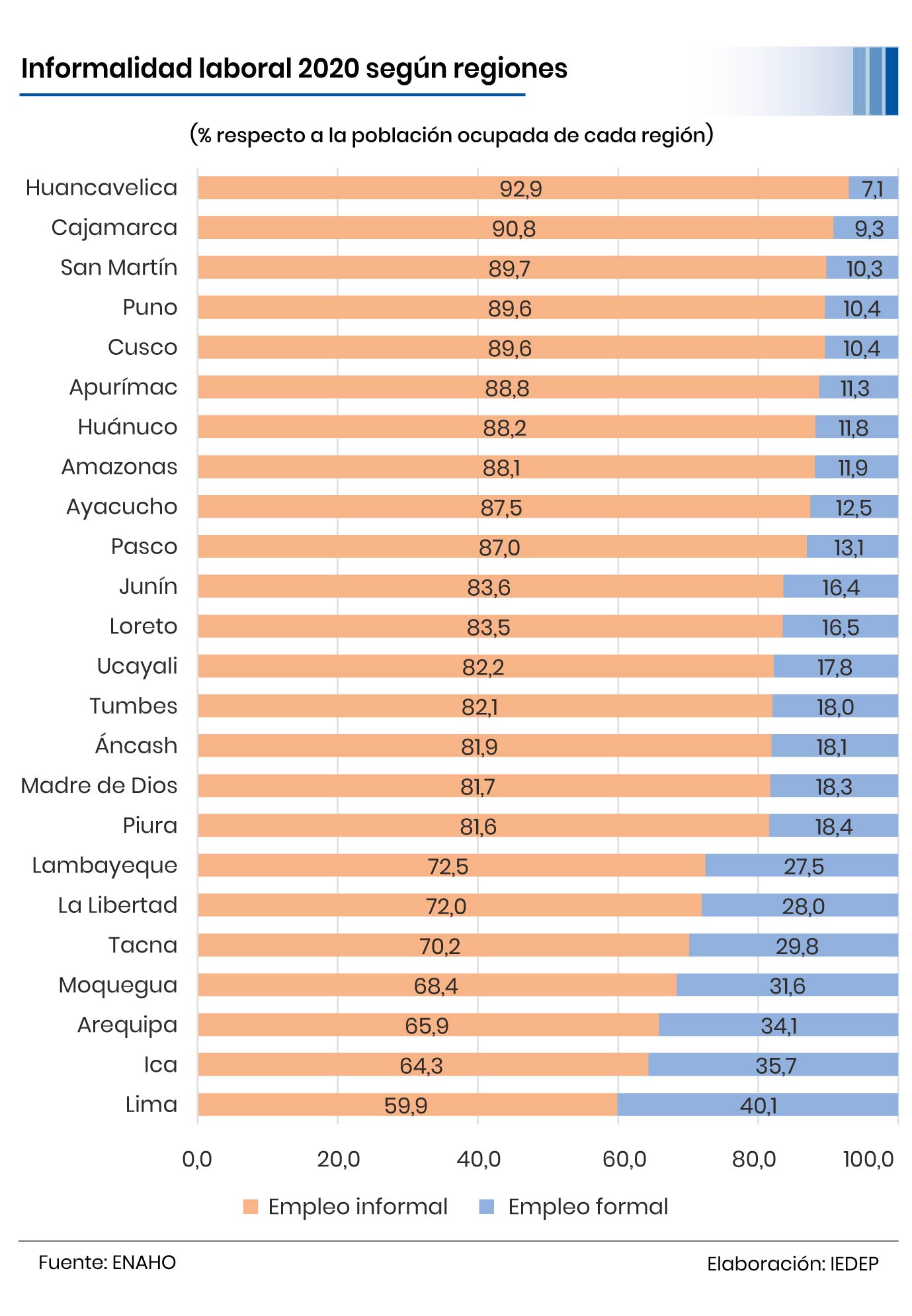 Cinco de las regiones más pobres del Perú tienen una informalidad que supera el 87%. Huancavelica (92,9%) y Cajamarca (90,8%) son las regiones con mayor porcentaje de trabajadores informales. Además, 15 regiones superan el 80% y otras tres superan el 70%. Moquegua (68,4%), Arequipa (65,9%), Ica (64,3%) y Lima (59,9%) son las que registran menor informalidad.
