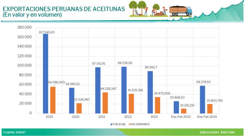 Para el periodo de enero a febrero de 2024, Perú exportó 20 toneladas de aceituna fresca por US$ 58 279, un incremento de 125,29 % en valor y de 93,37 % en volumen, con respecto a similar periodo de 2023. Ello, a pesar de registrarse un incremento de 16,50 % en el precio promedio por kilogramo durante el periodo analizado.