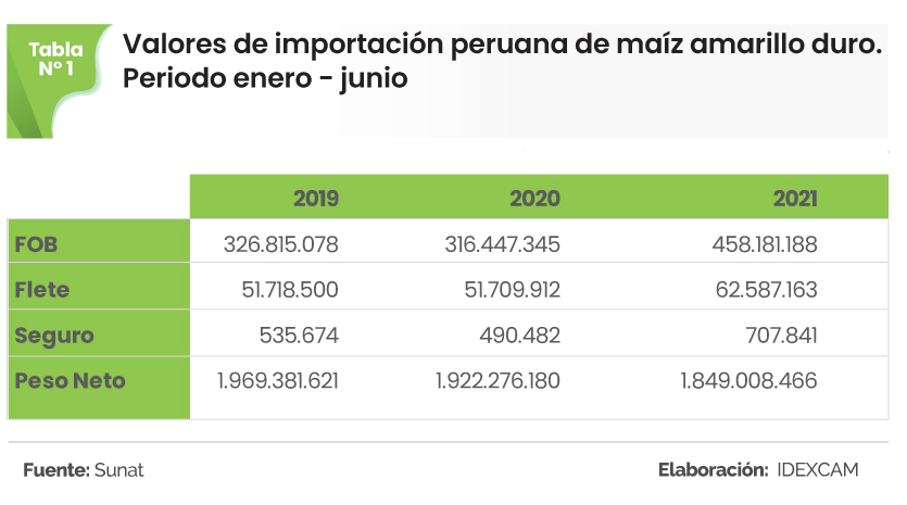 Según la base de la Sunat, el valor de las importaciones de maíz amarillo durante el primer semestre del 2021 aumentó en 45%, pero solo en valor, ya que el volumen disminuyó en 4%, esto quiere decir que el precio por kilogramo del maíz amarillo duro aumentó considerablemente, lo que produjo que el valor de las importaciones se incremente.