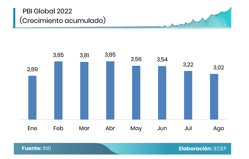 Con respecto al desempeño económico del país, las cifras publicadas por el INEI muestran un crecimiento de 3,02% para el periodo enero-agosto de 2022, respecto a similar periodo de 2021. No obstante, cabe señalar que se observa una desaceleración a partir de abril cuando el crecimiento anualizado se ubicó en 3,85%, para luego disminuir en mayo (3,56%), junio (3,54%) y julio (3,22%). Se espera que esta tendencia continúe durante el tercer trimestre del año y que haya alguna recuperación en el cierre de año por los incrementos en la masa salarial que se registrarán a partir de la segunda quincena del mes de noviembre.