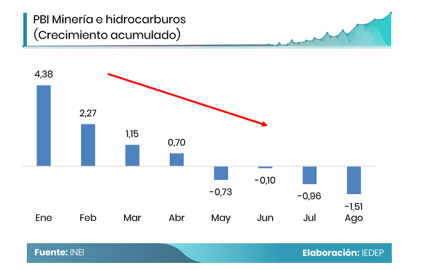 No obstante, sin duda el gran perdedor en el presente año es el sector Minería e hidrocarburos (-1,5%), el cual se ha contraído en cinco de los ocho meses transcurridos y con caídas superiores al 5% en los dos últimos meses. La producción de cobre ha caído en Southern y Las Bambas; la de oro en Hochschild y Retamas; la de zinc en Antamina, Tormocho y El Brocal; y la de plata en Volcan, Ares y Buenaventura. Asimismo, los conflictos sociales han afectado las operaciones de las empresas mineras.