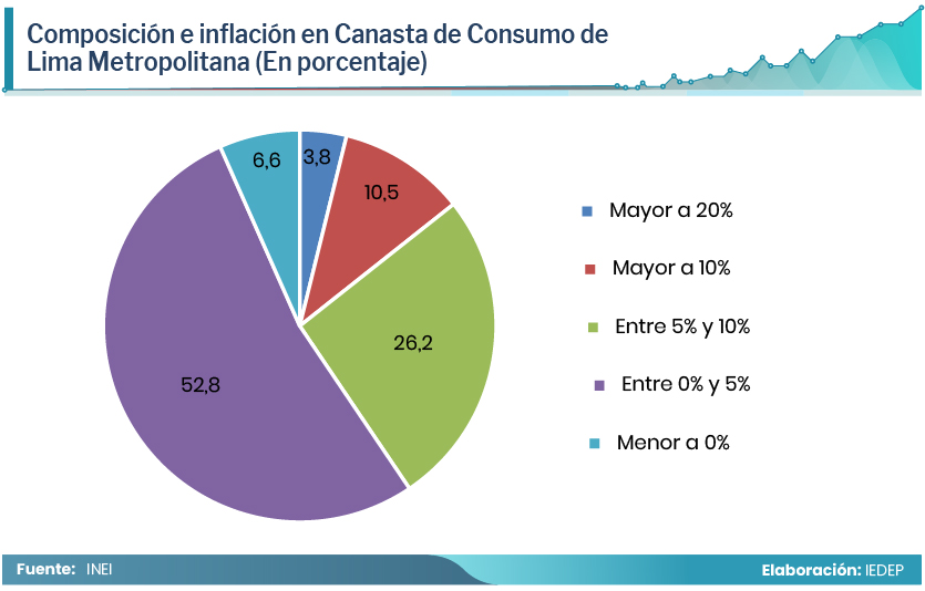 Entre los alimentos con mayor incremento de precios en lo que va de 2022 figuran la papa (+59,8%), huevos (+47,9%), tubérculos (+47,6%), azúcar refinada (+35,6%), choclo (+26,3%), pescados y mariscos (+24,3%), maíz (+19,4%), lentejas (+19%), pan (+16%) y leche evaporada (+14,2%), entre los más importantes. Cabe señalar que más de 70 productos de la canasta de consumo, la mayoría de ellos alimentos, han alcanzado una inflación por encima del 10% y para otros 140 productos el incremento de precios se ubica entre 5% y 10%.