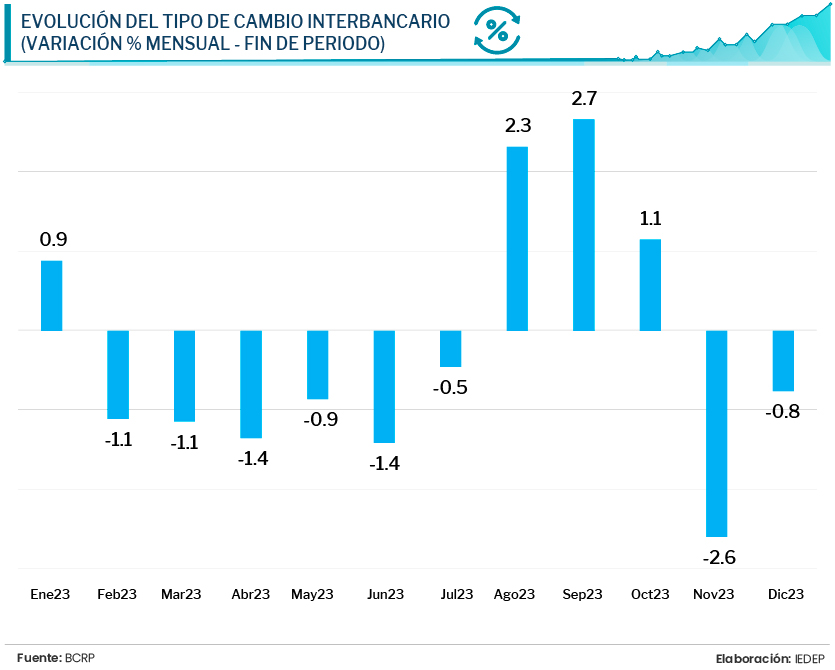 El tipo de cambio exhibió volatilidad en 2023, con aumentos en enero, agosto, septiembre y octubre (respecto al mes anterior); y caídas en los ocho meses restantes. El tipo de cambio de venta interbancario empezó el año con un valor de S/ 3,817 y cerró el 29 de diciembre con S/ 3,710. Es importante precisar que las caídas en noviembre y diciembre se explican por la sobreoferta de dólares de las empresas para el pago de la Compensación por Tiempo de Servicio (CTS) y gratificaciones de fin de año.