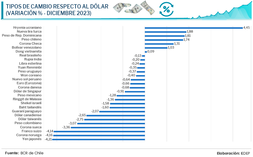 Sin embargo, algunas monedas se devaluaron considerablemente debido a factores de índole político, social o por la situación económica del país. Es el caso del peso argentino, que cayó -125 % frente al dólar, como resultado de la política de liberalización de precios iniciada por el nuevo gobierno como parte de su programa antiinflacionario. Otras monedas depreciadas incluyen el Hryvnia ucraniano (-4,45 %), afectado por el conflicto bélico con Rusia; la nueva lira turca (-1,88 %), agobiada por una elevada inflación; y el peso chileno (-1,74 %) con una inflación por encima del 7% y una caída proyectada de su PBI para el 2023 (-0,2 %).