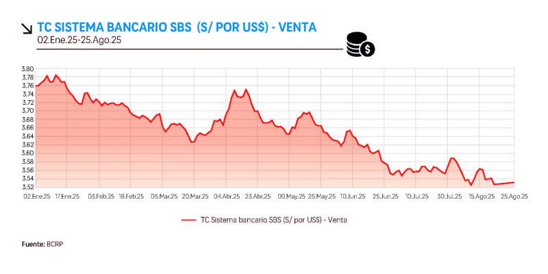 En lo que va del año (hasta el 25 de agosto), el sol se ha fortalecido frente al dólar en 9.44 %, con una clara tendencia que solo se interrumpió entre abril y mayo cuando el tipo de cambio se mantuvo encima de los 3.7 soles por dólar.