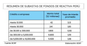 Para la colocación de los fondos de Reactiva Perú el BCRP ha realizado cuatro subastas de Repos con Carteras Garantizadas. En total se han colocado S/ 14.383 millones, un 48% del Programa. Se identifican cinco tramos disponibles de créditos para empresas: S/ 42 millones para préstamos de hasta S/ 10.000 a una tasa de interés promedio del 3,13%; S/ 241 millones para préstamos entre S/ 10.000 y S/ 30.000 a una tasa del 1,83%; S/ 1.800 millones para créditos entre S/ 30.000 y S/ 300 .000 al 0,92%. Luego se tienen S/ 6.800 millones para créditos entre S/ 300.000 y S/ 5 millones al 1,09%; y, finalmente, S/ 5.500 millones para créditos entre S/ 5 millones y S/ 10 millones a una tasa de 1,09%.