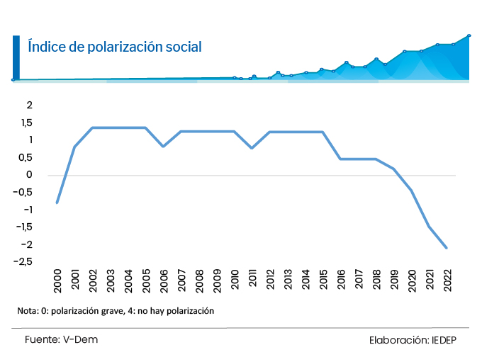 Nuestro país no es ajeno a este riesgo, considerando cómo ha evolucionado el Índice de Polarización Social, elaborado por Varieties of Democracy (V-Dem), de 2020 a 2022, y que muestran claros deterioros que posicionan al Perú en un estado de polarización grave. Es decir, existen importantes diferencias de opinión sobre casi todos los temas políticos relevantes para la sociedad.